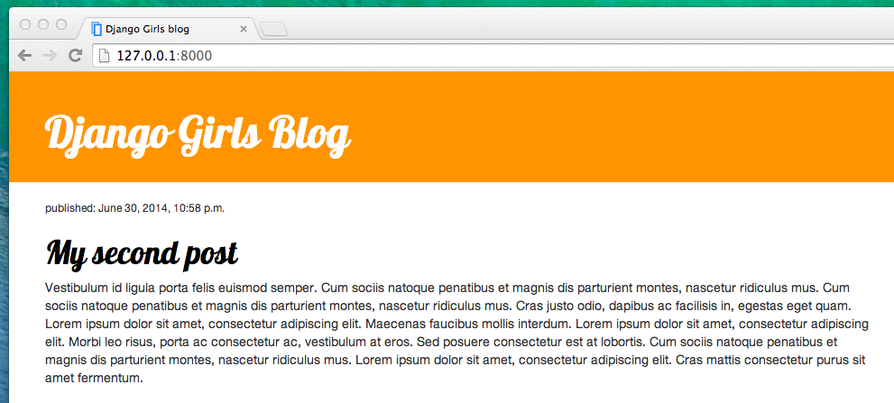 Agora adicione a linha font-family: 'Roboto'; no CSS do arquivo static/css/blog.css dentro do bloco de declaração h1 a (o código entre as chaves { e }) e atualize a página: