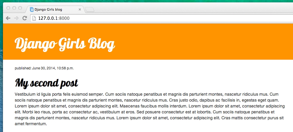 </div>Agora adicionaremos blocos de declaração para seletores diferentes. Seletores começando com . se referem às classes. Existem muitos tutoriais e explicações sobre CSS na Web para ajudar você a entender o código a seguir. Por enquanto, basta copiar e colá-lo em seu arquivo blog/static/css/blog.css :