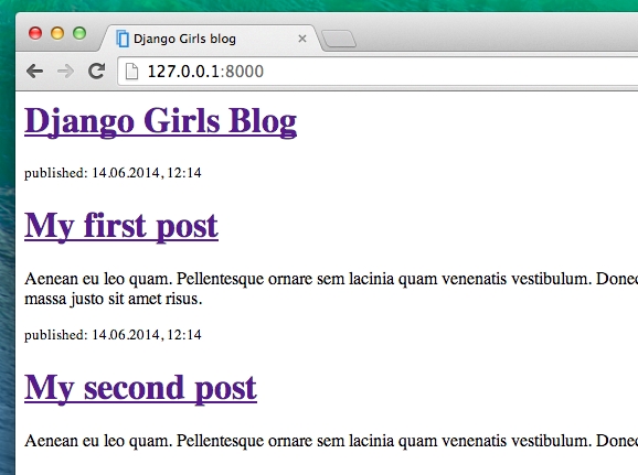 O que nós realmente queremos fazer é exibir postagens reais que foram adicionadas no Django admin - e isso é o que faremos em seguida.
